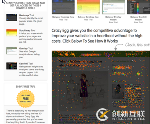 Crazy Egg是一款非常強大的網(wǎng)站用戶行為分析工具,它獨特的熱力圖heatmaps可以準確記錄網(wǎng)頁所有的點擊,甚至包括那些沒有鏈接的地方。使用Crazy Egg很簡單,首先你點擊這里獲得Crazy Egg,然后在你的目標網(wǎng)頁中加入簡單幾行代碼,這和Google Analytics是相似的;最后,就是體驗Crazy Egg魅力的時刻了,相信它會是你評估網(wǎng)站流量價值、提高網(wǎng)站轉化率的得力助手。