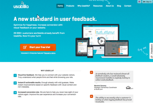 Usabilla 展現(xiàn)你要給測試人員的畫面,并且問他們一些問題,他們通過點擊或者添加注解在畫面上來回答。你選擇問什么問題可以是來自于預設裝置列表,也可以自己提供。你可以提供截屏畫面,或者只要把URl輸入Usabilla就會為你生成截屏畫面。Usabilla 不會從他們管理的座談小組中給你招募用戶。相反,他們會 給你一些發(fā)給測試者的鏈接,或者提供一些Java程序語言密碼放 置在你的網(wǎng)站上,邀請用戶來參加測試。