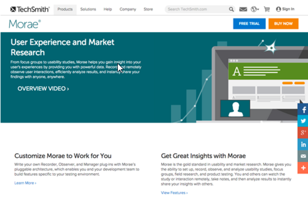 Morae讓你記錄,分析結果,并輕松分享你的研究。Morae不僅可以記錄用戶的行為,還可以監(jiān)控并標記過程中的關鍵時刻,在后期對數(shù)據(jù)的分析和結果報告方面也能提供幫助,有助于提高工作效率,非常適合研究員在項目中采用。