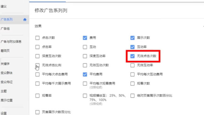 首先選擇廣告系列,我們也可以分別查看每個(gè)廣告系列的數(shù)據(jù),或者還可以選擇不同時(shí)間段來看相關(guān)數(shù)據(jù)。點(diǎn)擊列;,選擇修改列;,再選擇效果;,添加無效點(diǎn)擊次數(shù);,和無效點(diǎn)擊比例;,最后按應(yīng)用;,這樣就做好啦!這兩列將會(huì)幫助你監(jiān)測(cè)你廣告系列的無效點(diǎn)擊情況,無效點(diǎn)擊次數(shù);這一列顯示在指定時(shí)間內(nèi)的無效點(diǎn)擊數(shù)目。