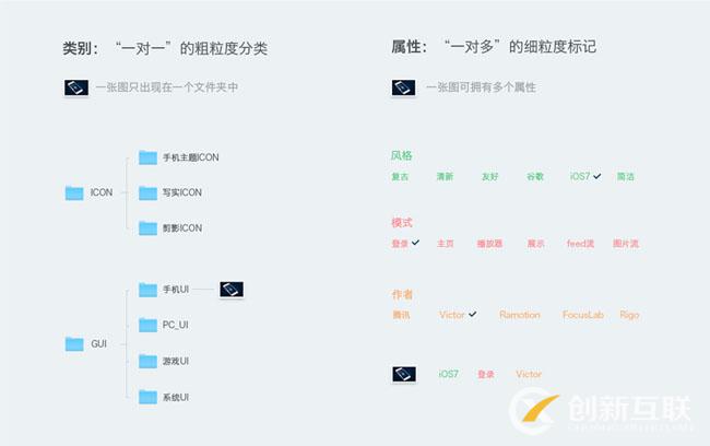 先思考一下我們篩選圖片時候的需求,可以分解成不同的粒度:有時就單純想看所有“web ui”設計圖;有時可能我們會想搜“iOS7風格的”,“手機UI”,“播放器”所有設計圖,那么面對這種粗粒度和細粒度,應該怎樣對圖片分類呢?有的同學可能想當然:文件夾分的細一點就行了啊。其實不然,面對這么多圖片,科學的管理狀態(tài)應遵守“MICE”原則(Mutually Exclusive Collectively Exhaustive),既“相互獨立,完全窮盡”,做到不重疊、不遺漏的分類。而只用文件夾分類,是沒辦法做到這點的。上文中的例子中,就算把文件夾分的很細,“iOS7”一個文件夾,“播放器”一個文件夾,“手機UI”一個文件夾,那么所有符合這三個條件的圖片就得出現(xiàn)在這三個文件夾中,重復3次,大大降低了管理效率。如何做到“不重疊、不遺漏”?