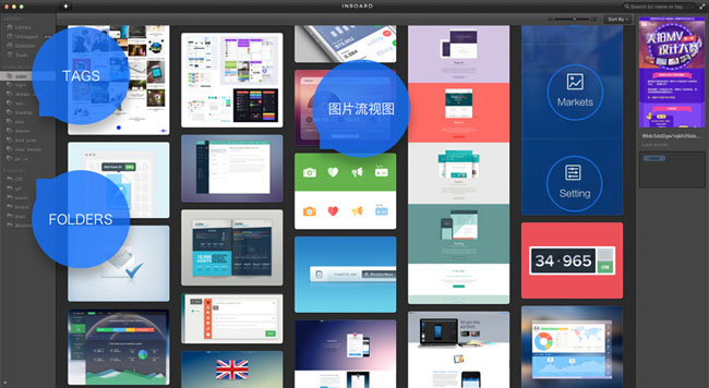 三欄布局,重點是左邊前兩欄。Inboard提供了Tags和Folders這兩個功能,字面翻譯是標簽和文件夾,但別誤會,這個文件夾和系統(tǒng)文件夾一、點、關、系、也、沒、有!!而且Inboard支持同一個圖片出現(xiàn)在不同文件夾里,你會感覺這個功能是在滿足之前我們說的第二步:用“一對多”的屬性做圖片管理的需求。而Tags,除了展示數(shù)量有限,不支持編輯以外,居然看不出和Folders功能的區(qū)別。。。TAGS和FOLDERS之間也是沒有任何層級關系和邏輯關系的,所以,Inboard提供的管理工具,其實有些混亂。第二欄圖片流視圖就很不錯啦,瀑布流布局,大大提高了圖片瀏覽效率,不過這是每一款圖片管理軟件的“標配”,大同小異罷了。