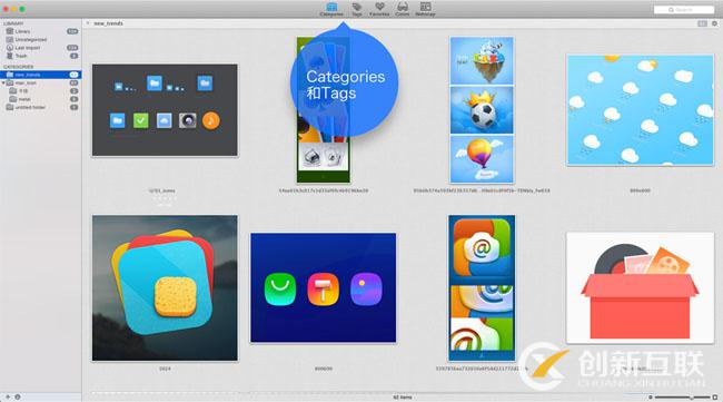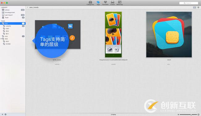 但是,這里的Categories和Tags是兩個互為獨立的功能,兩種功能沒法組合使用,要么用categories,要么用Tags,這就讓人頗為不爽。而之前已經(jīng)分析過了,“一對一”的種類和“一對多”的屬性其實是粗粒度和細粒度兩個層級之間的。當然,由于Tags有標簽組功能,你完全可以使用Tags來滿足對“種類”這個粒度的分類需求。但是只能細化到一個層級,而且不同的tag是完全沒辦法取交集或者并集的,比如,如圖中,雖然有“WUI”,“iOS7”,”WUI”這些tag,你也是永遠沒馬上篩選出“iOS7風格,簡潔風格的WUI界面”的圖片的。所以,管理功能仍然不夠強大。