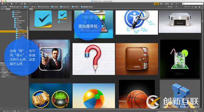 Bridge支持配置多種視圖,上圖是我的“靈感管理”視圖,可以看到三欄布局,左欄有樹狀文件夾瀏覽模式和文件夾收藏。其中樹狀文件夾能提高文件夾結構的瀏覽效率,而文件夾收藏則相當于快捷訪問區(qū),你可以把文件夾直接拖到這里來,以后可以直接在這個面板訪問常去的文件夾。上邊欄是能快速導航的面包屑導航條,能自動展開子文件夾列表。瀏覽效率比起其他軟件只增不減,而且規(guī)避了“庫”的風險。