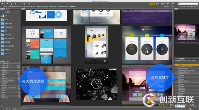 然而,粗粒度的分類是無法滿足設計師的整理需求的。一個大類別文件夾(比如WEB UI)里往往出現(xiàn)上千張圖片。如何進一步分類?這時,系統(tǒng)文件夾就無法滿足我們的需求了,因為細粒度的類別往往其實是比較具體的“屬性”,比如作者,風格,顏色,這些屬性在不同種類的圖片文件之間是存在大量交集的。如果繼續(xù)用文件夾分類,你會發(fā)現(xiàn)如果在“WEB UI”下建立“清新配色”“iOS7”“播放器”“主頁”此類子文件夾,那么“手機UI”下也必須建立這些同樣名字的文件夾,這樣就出現(xiàn)了重復,造成了低效。而且文件夾層級不宜過深,超過三層之后,往往管理無力,尾大不掉。對圖片屬性的管理,我們需要的是比文件夾更強大的圖片管理工具,來完成上述這兩個圖片分類和整理的核心需求。請牢記這兩個需求,下面會多次提到。待會兒,我會讓主角出場——Adobe Bridge。
