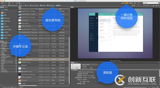 先來大致看下我配置的項目管理視圖,Bridge支持自定義工作視圖,我一般用兩種,靈感庫管理視圖和項目文件管理視圖,右上角可以一鍵切換。第二欄是列表視圖,方便瀏覽文件的全名、擴展名和常用屬性。第三欄有預覽模塊和元數(shù)據(jù)模塊,能快速預覽圖片和文件自身的一切相關信息