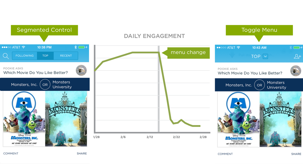雖然與切換菜單(右)的界面看起來(lái)比具有分段控件的界面(左)更清晰,但后者已經(jīng)獲得了更多的參與。圖片:Luke Wroblewski)