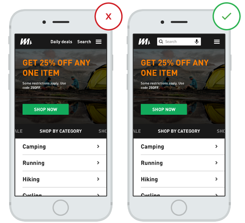 如果搜索是你的應(yīng)用程序的主要功能,則需要在人員面前。不要隱藏它或者將其顯示在屏幕的頂部,或者是具有激活搜索模式的可見參考(放大鏡圖標(biāo))。