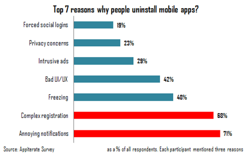 每天,用戶都被無(wú)用的通知轟炸,干擾他們的日常活動(dòng),且令人厭煩,討厭的通知是人們卸載移動(dòng)應(yīng)用程序的首要原因(依據(jù)71%的受訪者)。