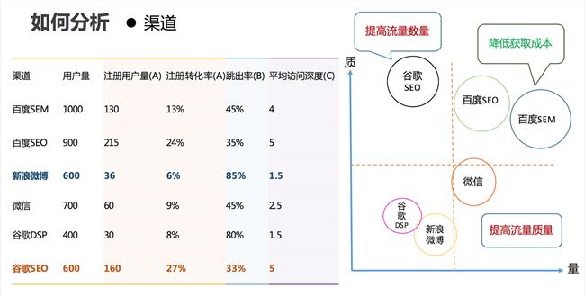 1. 渠道流量渠道問題是指不同渠道獲取流量的數(shù)量、質(zhì)量和成本。我們可以根據(jù)不同渠道的流量數(shù)量,以及不同渠道用戶進入產(chǎn)品后的跳出率,注冊轉化率以及平均訪問深度來評斷渠道的好壞。跳出率高說明該渠道來的流量并不是產(chǎn)品的目標用戶,或者是因為在該渠道投放的文案和產(chǎn)品本身不太匹配,導致他們進入產(chǎn)品后看了一眼就離開了。注冊轉化率高說明該渠道來的流量質(zhì)量越高,這個指標一般是和跳出率成負相關的。平均訪問深度說明了用戶在產(chǎn)品內(nèi)的使用深度,平均訪問深度越高說明用戶對產(chǎn)品的使用度越高,吸引用戶留下的可能性越高。