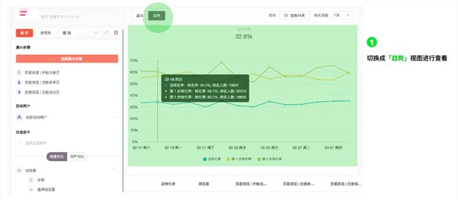 這樣,一個簡單的漏斗就創(chuàng)建成功了,我們可以看到基本的轉化情況,總體轉化率是 32.8%:
