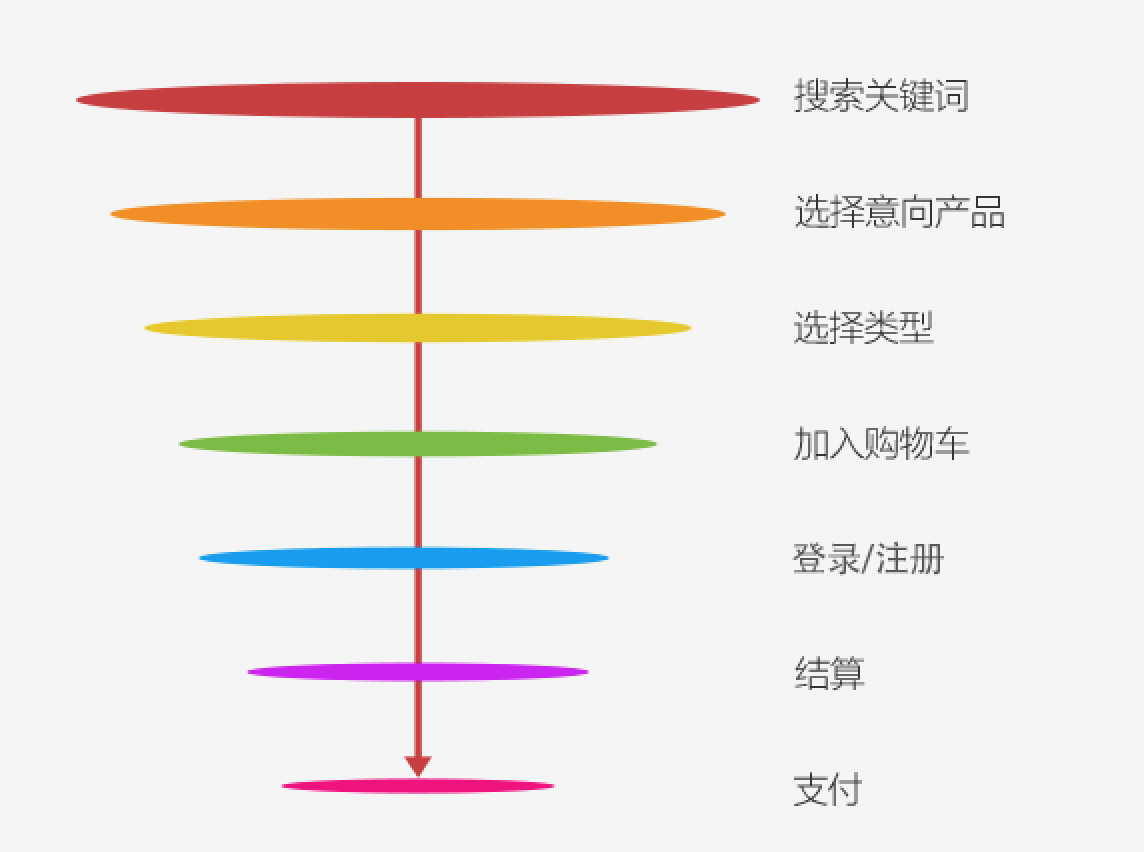 以未注冊或未登錄用戶搜索購物轉(zhuǎn)化為例,漏斗模型為用戶購物流程所要經(jīng)過的核心流程步驟,用戶在流程的走向過程中是逐漸減少的,我們要做的是減少每一個步驟的中用戶的流失率。