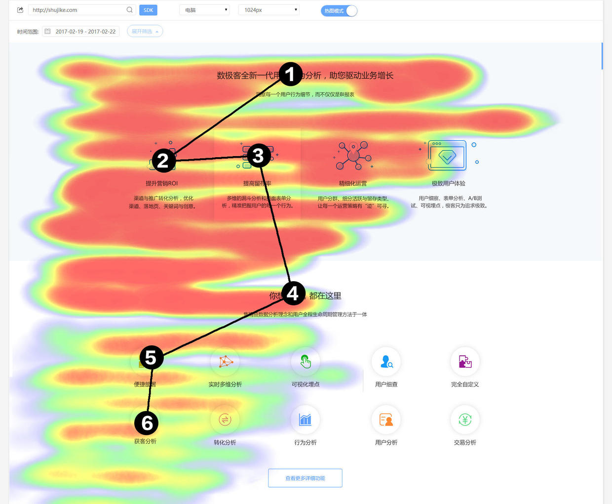 痛點路徑并不是由規(guī)模數(shù)據(jù)智能繪制的一張圖,而是需要結(jié)合用戶的痛點和視覺走向手動繪制,紅色區(qū)域代表用戶最為關(guān)注的痛點,數(shù)字和線條代表用戶關(guān)注痛點的視覺路徑。