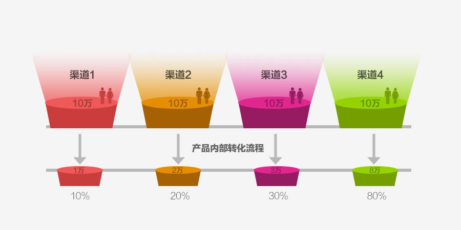上圖中,假設(shè)四種渠道在資金及人力投入相同的情況下,并且都能拉到10萬用戶(為了方便理解,都用簡單的整數(shù)),渠道1的轉(zhuǎn)為率為10%,渠道4的轉(zhuǎn)化率為80%,那么在對比了四個渠道后,我們應(yīng)該做的是加大渠道4的投入減少渠道1的投入。