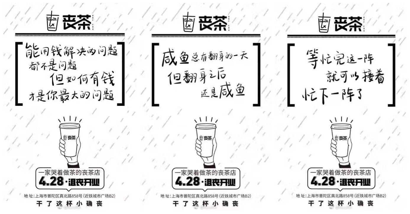 喪茶開業(yè)前的海報文案沒有直接介紹茶有什么特別的,只是套用了幾句常見的段子。