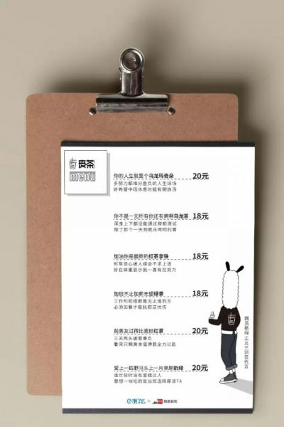 另外,喪茶推出的六款奶茶都起了很“喪”的名字。“你的人生就是個烏龍瑪奇朵,加油你是最胖的紅茶拿鐵,前男友過得比我好紅茶,加班不止加薪無望綠茶……”