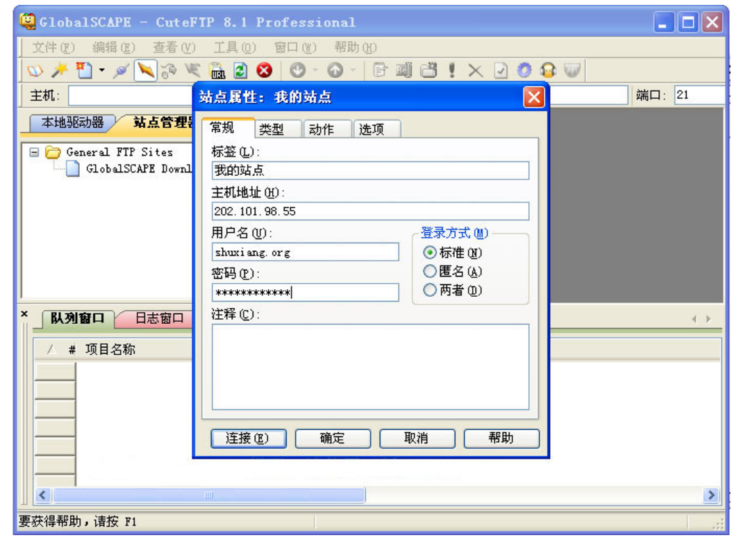 2.2.3、在彈出站點(diǎn)對(duì)話框里面輸入“標(biāo)簽”名稱(chēng),例如:我的站點(diǎn);在“主機(jī)地址”輸入FTP的IP地址,例如:8.8.8.8; 并輸入用戶(hù)名和密碼,例如:abc.com,點(diǎn)擊“確定”或者“連接”,如下圖: