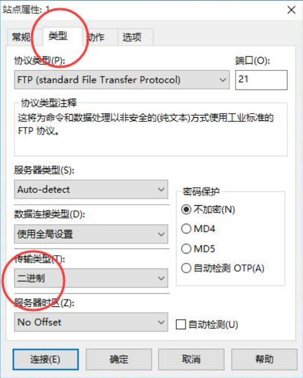 需要特別注意的是,傳輸類(lèi)型一定要設(shè)置為二進(jìn)制,否則會(huì)導(dǎo)致傳輸文件出錯(cuò),造成網(wǎng)站無(wú)法訪問(wèn)。