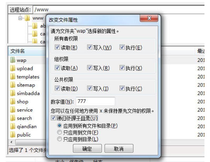注意,需要勾選遞歸處理子目錄應(yīng)用到所有文件夾和目錄。如果修改權(quán)限不生效,可咨詢(xún)空間商處理。