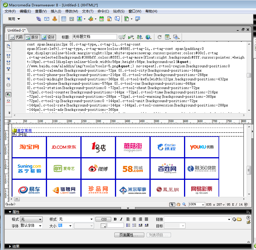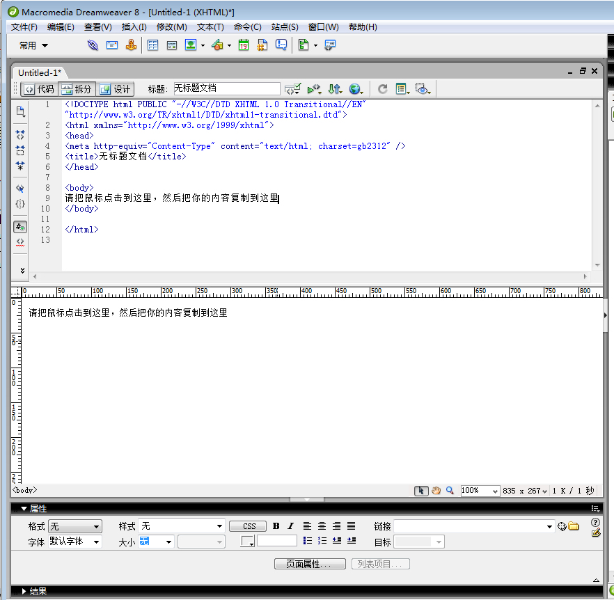 (3)編輯區(qū)分代碼、拆分、設(shè)計三個部分,一般點擊到拆成狀態(tài)就可以,這樣的話可以同時看到排版效果和代碼兩種(下面是設(shè)計區(qū),上面看到有默認代碼的部分是代碼區(qū)),把你的鼠標(biāo)點擊一下下面的設(shè)計區(qū),然后把內(nèi)容復(fù)制到這一塊。