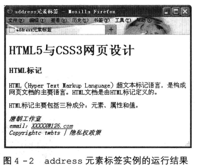 ( 1 ) addres,元素的’.標簽內(nèi)容”會以斜體字呈現(xiàn),且大多數(shù)瀏覽器會在address元素的前后添加一個換行符,自動進行換行。