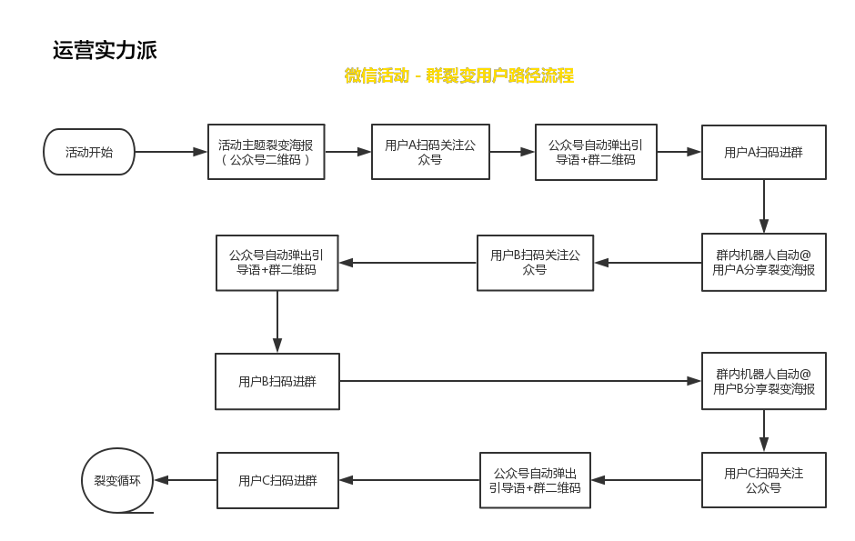 用戶(hù)路徑:裂變海報(bào)(活動(dòng)母碼)推送給用戶(hù),用戶(hù)掃碼后關(guān)注公眾號(hào)并會(huì)收到進(jìn)群引導(dǎo)&群二維碼,用戶(hù)掃碼會(huì)隨機(jī)匹配到活動(dòng)群,進(jìn)群后群內(nèi)機(jī)器人@用戶(hù)并引導(dǎo)用戶(hù)分享活動(dòng)海報(bào),用戶(hù)分享后即可領(lǐng)取相應(yīng)獎(jiǎng)勵(lì),同時(shí)活動(dòng)迅速在好友關(guān)系中裂變開(kāi)。