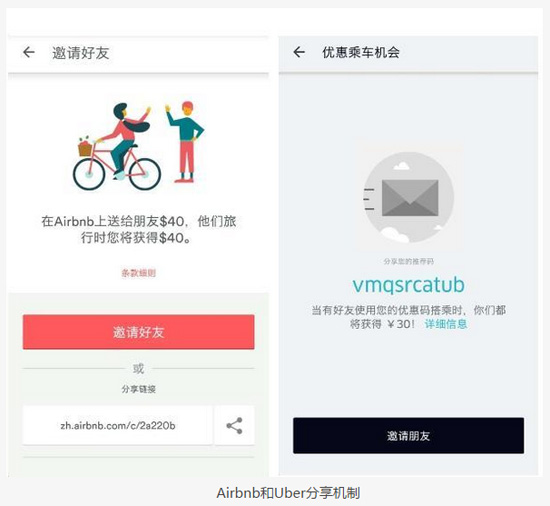 在分享機(jī)制上,Uber和Airbnb是做的非常好的,值得大家來參考。這兩個產(chǎn)品的分享采用的是User Referral,可以理解為「介紹人機(jī)制」。采用一對多的方式,讓用戶介紹自己使用的產(chǎn)品,推薦給好友使用,一旦成功推薦,好友開始使用產(chǎn)品了,那么推薦者和被推薦者都都會獲取獎勵。