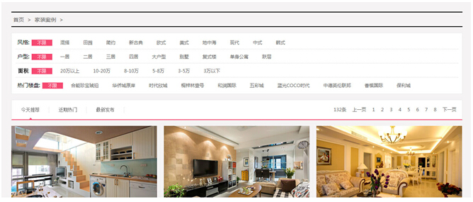 C、家裝案例:風格類別(如:現代簡約、簡歐、中式。。。),文字鏈接到“家裝案例”一級欄目的首頁,下面配圖,圖片鏈接到案例內頁。