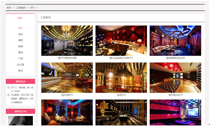 D、工裝案例:按類別(如:KTV、辦公室、茶樓。。。)分類,文字鏈接到“工裝案例”一級欄目的首頁,下面配圖,圖片鏈接到案例內頁。基本格式同家裝案例。