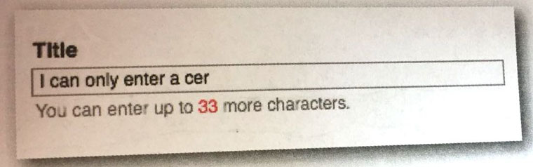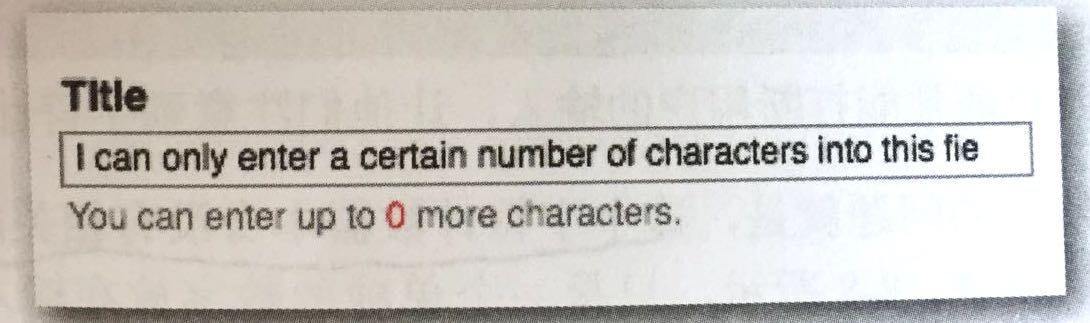 首先,在用戶開始輸入之前,會(huì)提示用戶限制可以輸入的字符數(shù)。 在用戶輸入過(guò)程中,為了防止用戶統(tǒng)計(jì)他可以輸入多少個(gè)單詞,應(yīng)設(shè)置一個(gè)隨單詞數(shù)而變化的計(jì)數(shù)器; 數(shù)字樣式(顏色,厚度,大小)提醒用戶可以輸入的字符數(shù)量已經(jīng)很少。 該計(jì)劃如下: