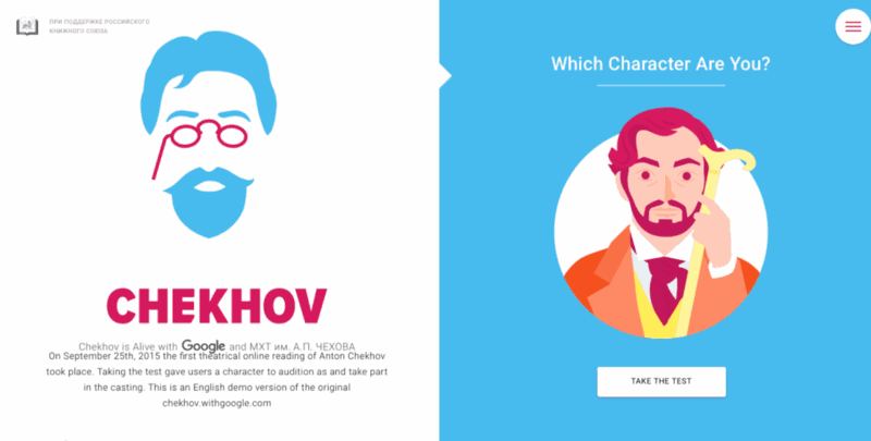 動效越來越多的參與到我們的UI設(shè)計和交互中來,使用動效來鼓勵用戶但與到交互中是非常合理的設(shè)計策略。看看下面 Chekhow is Alive 這個網(wǎng)站的設(shè)計,設(shè)計師通過動效展示不同的角色,與你進行匹配。