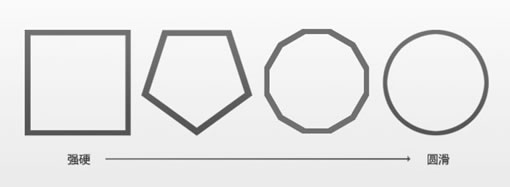 上圖中我們可以看到,方形過度到圓形的變化,圓形是由極其細(xì)小的邊角組成,在變化當(dāng)中圖形變得越來越有樂趣,比較下來圓形在幾何圖形中具有平滑流暢的邊緣,圓形更讓人感覺輕松,愉悅。設(shè)計(jì)需要增加樂趣的時(shí)候,我們可以多運(yùn)用流暢線條的圖形來讓頁(yè)面活躍起來。