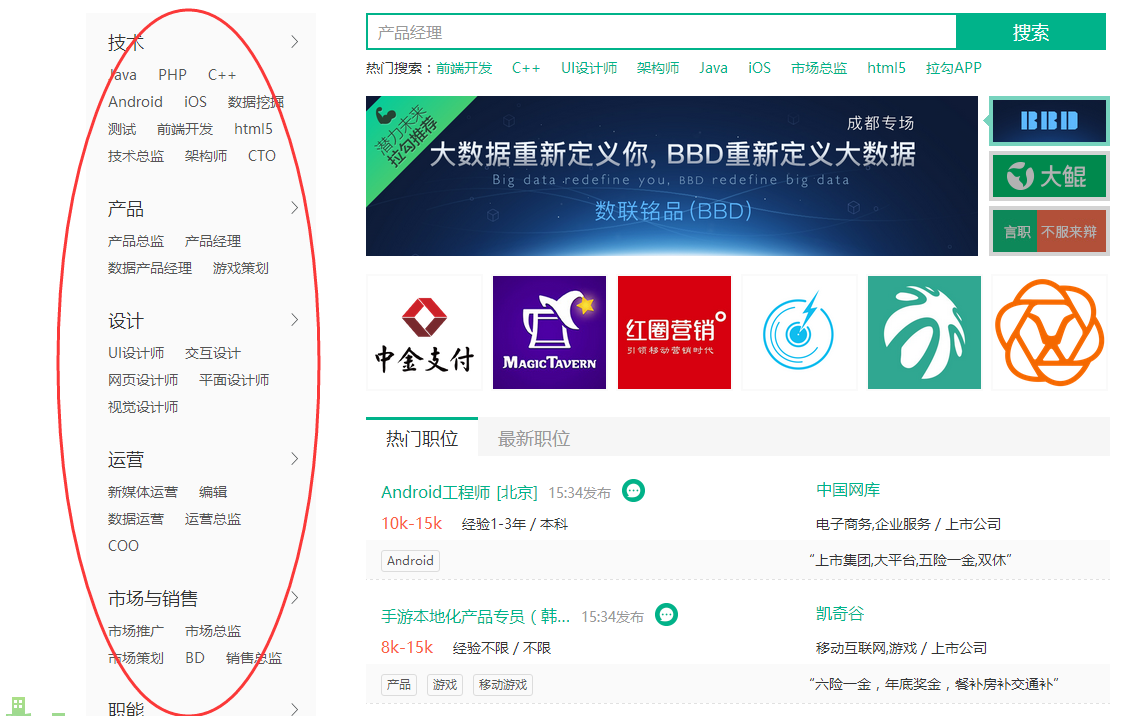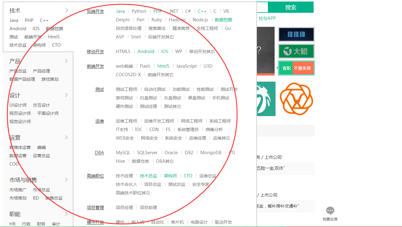 邏輯包含的部分視覺嵌套:技術(shù)包含后端,移動,前端,測試等,所以后者為前者的二級菜單;