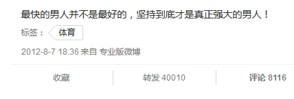 2012年奧運會,劉翔舊傷復(fù)發(fā),跨欄摔倒,但堅持走完全程。杜蕾斯對此發(fā)出如下微博:最快的男人并不是最好的,堅持到底才是真正強大的男人!