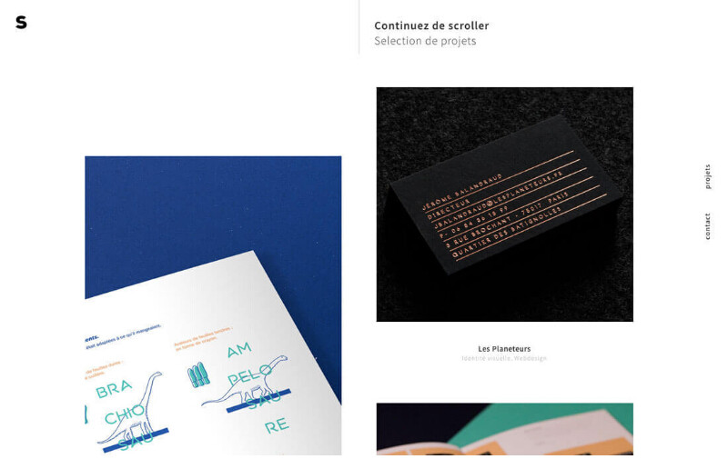 和側(cè)邊欄導(dǎo)航不同,這種完全旋轉(zhuǎn) 90 度到右側(cè)的文字導(dǎo)航,設(shè)計(jì)的更加微妙,通常出現(xiàn)在小型的作品展示型的網(wǎng)頁上。就像上方這個(gè)名為S的網(wǎng)站。