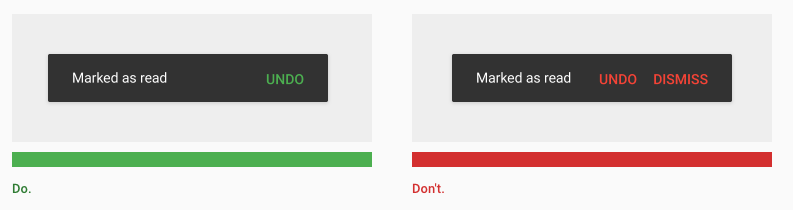 簡潔:提示的文案要簡短,包含的操作按鈕最多只有一個(gè),或者沒有。(注意,snackbar不能包含使其消失的“取消”按鈕!)