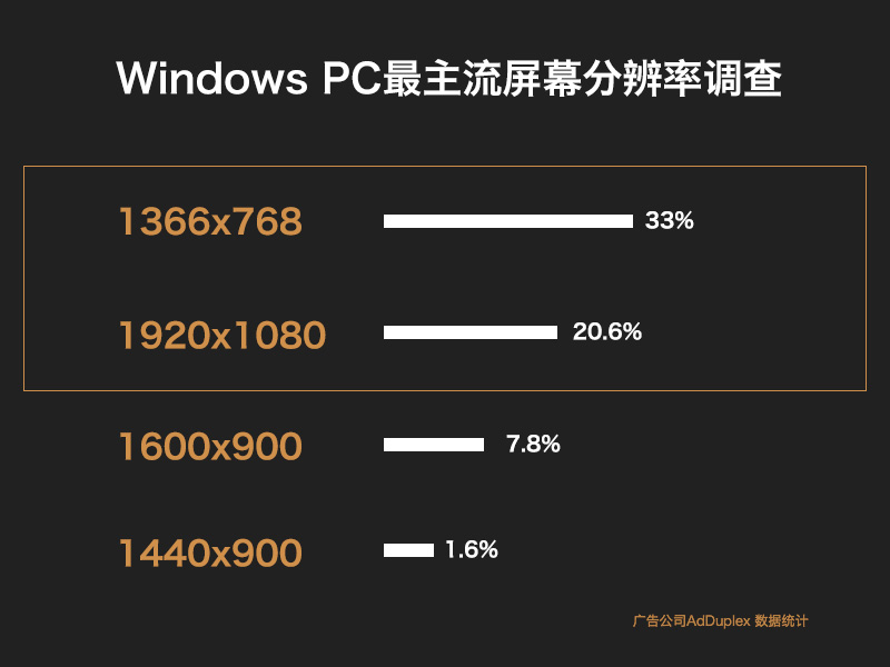 △ 廣告公司AdDuplex 大數(shù)據(jù)顯示(最主流的PC屏幕分辨率依然是1366×768,而Win10系統(tǒng)下依然有近34%的設(shè)備保持這個(gè)分辨率,只有27%以上的PC在全高清或者更高級(jí)別)