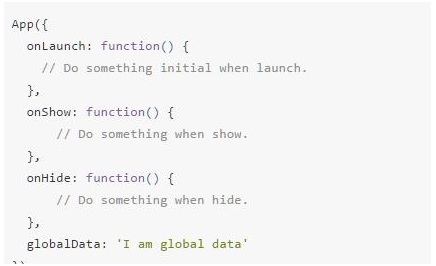 其中onLaunch,onShow,onHide用于響應(yīng)生命周期回掉,也可自定義全局變量及方法。