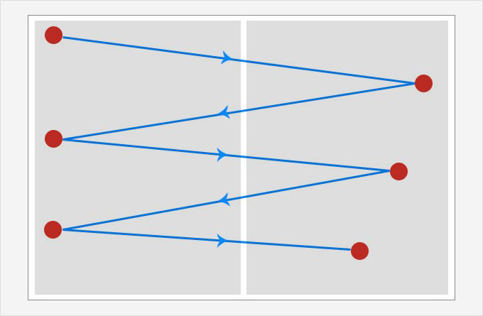讓你的設(shè)計和布局兼容“之”字形非常簡單。實際上,這和將你的頁面分為兩等份一樣簡單!兩等分的效果很好,因為“之”字形的端點或多或少能對齊到這兩等分的中心。疊加使用,它們能很好的相互呼應(yīng)。將重要元素放置在你網(wǎng)頁中“之”字形的紅色端點處,這就是分割布局或者說1/2布局包含的基本理念。