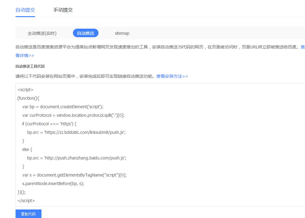 <script> (function(){ var bp = document.createElement('script'); var curProtocol = window.location.protocol.split(':')[0]; if (curProtocol === 'https') { bp.src = 'https://zz.bdstatic.com/linksubmit/push.js'; } else { bp.src = 'http://push.zhanzhang.baidu.com/push.js'; } var s = document.getElementsByTagName("script")[0]; s.parentNode.insertBefore(bp, s); })(); </script>