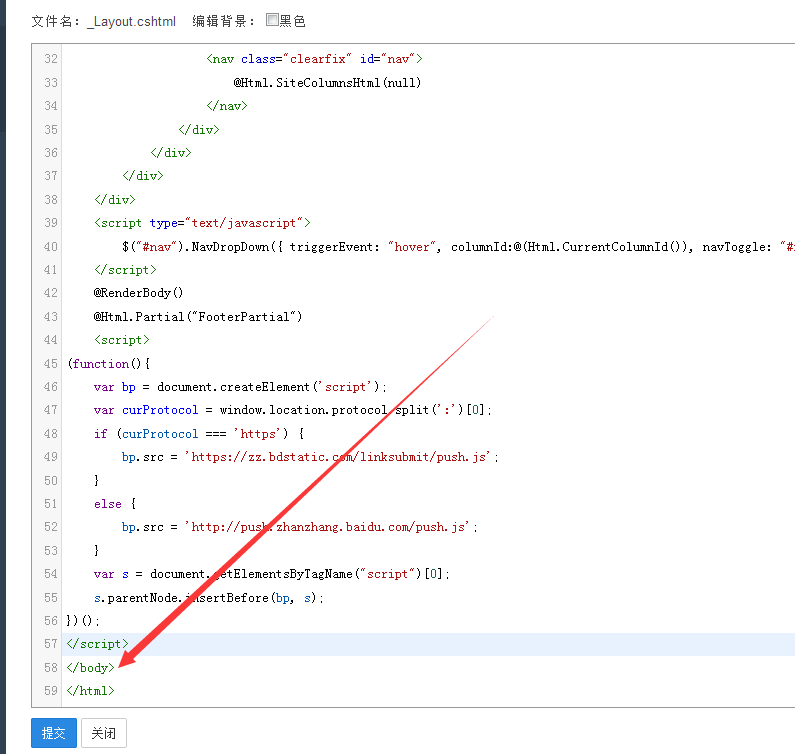 4、點擊編輯,彈出代碼編輯窗口,把百度提交代碼粘貼到</body>標簽前面即可: