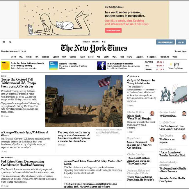 紐約時(shí)報(bào)網(wǎng)站可看出RWD的實(shí)際運(yùn)用。桌上型電腦/筆記型電腦(上方)的3列式設(shè)計(jì),更改為平板電腦上的2列式設(shè)計(jì)(左下角)和手機(jī)上的1列式設(shè)計(jì)(右下角)。